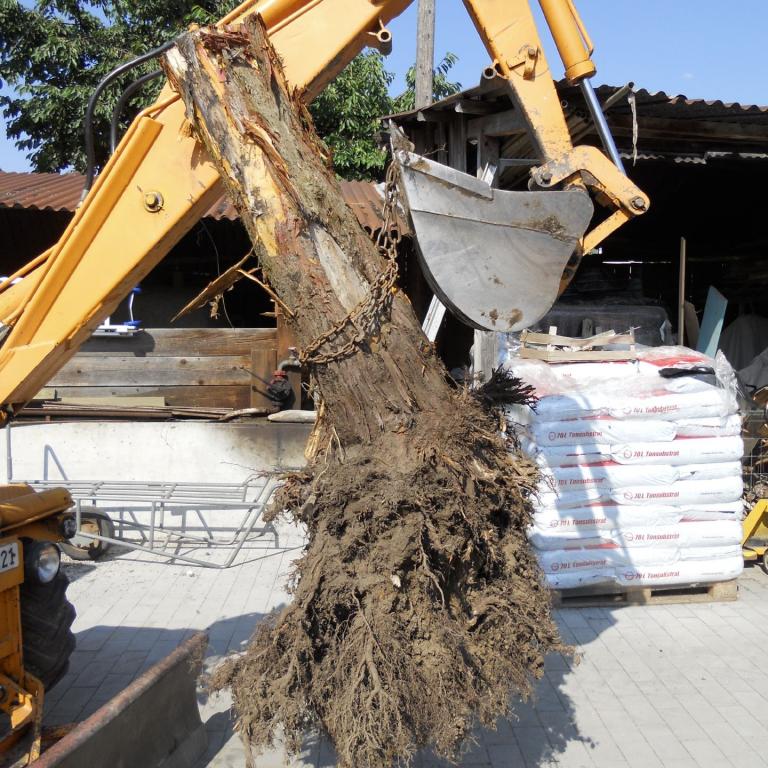 Stockentfernen durch Ausgraben mit Bagger oder von Hand (kein Stockfräsen, beim Fräsein bleibt viel Holz im Boden und wirkt sich oft negativ auf die Folgepflanzung aus. Absenkungen beim Verrotten. Im schlimmsten Fall wächst nicht einmal der Rasen mehr richtig)