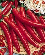 Rote, ca. 10 cm lange, schmale, sehr scharfe Schoten. Benötigt warme, geschützte Lagen. Auch zum Trocknen geeignet