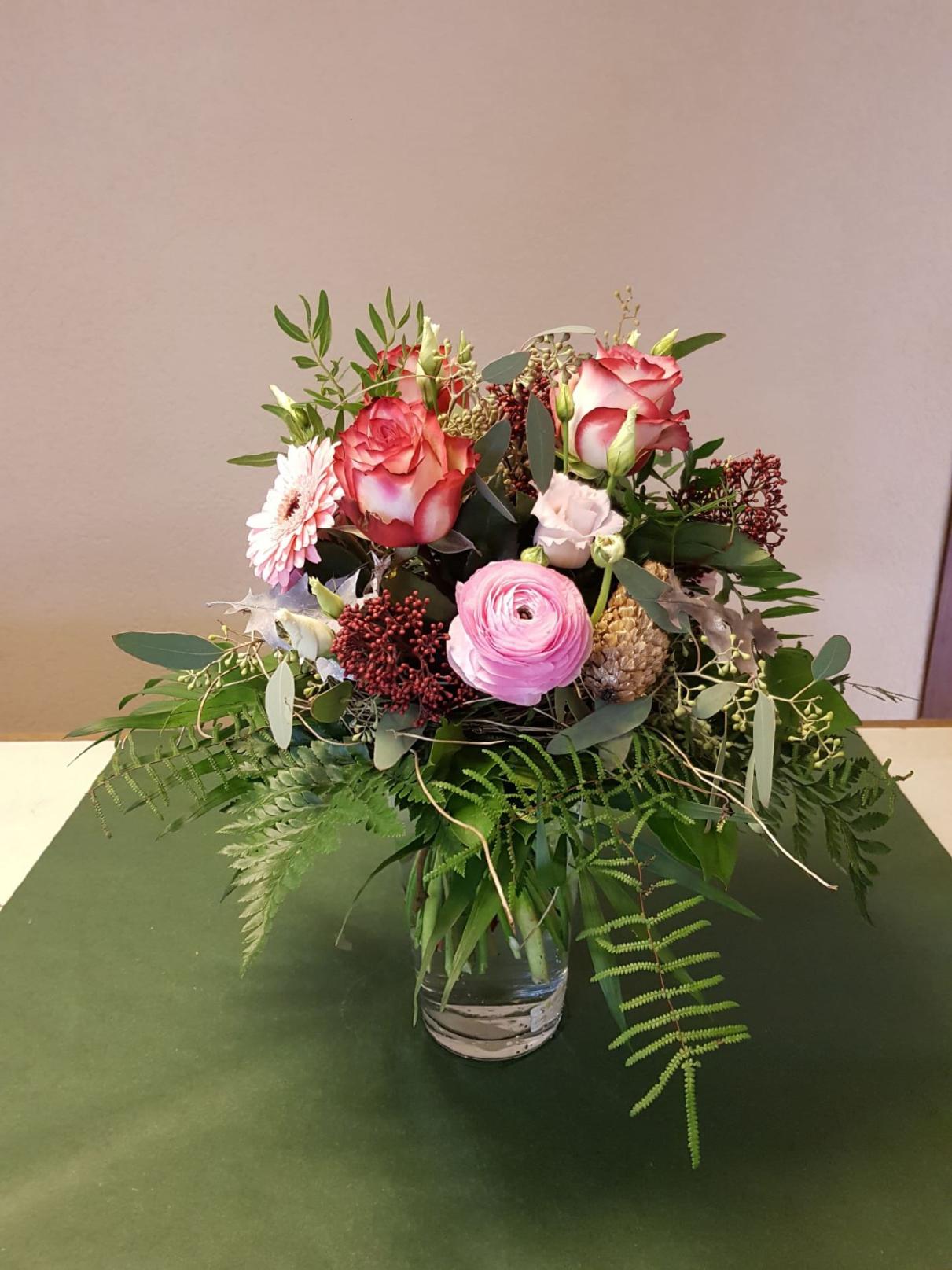 Runder Strauss mit Rosen und Ranunkeln mit Grünabschluss